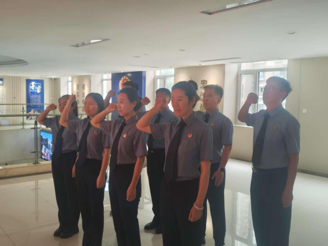 干警们面向鲜红的党旗,在党支部书记的带领下,高举右拳,齐声宣读入党誓词。铿锵有力的誓言在现场回荡,字字千钧的承诺直击心灵,让党员们再次重温入党时的庄严承诺和坚定决心。