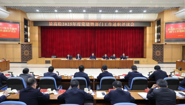 1月26日,最高人民检察院召开2025年度党建暨部门工作述职评议会。最高检党组书记、检察长应勇强调,要坚持以习近平新时代中国特色社会主义思想为指导,深入学习贯彻习近平总书记关于党的建设的重要思想、关于党的自我革命的重要思想,坚持以党的政治建设为统领,统筹抓党建带队伍促业务,持之以恒推进全面从严治检,全面提高机关党建工作质量,促进提升检察履职质效,持续推进习近平法治思想的检察实践。