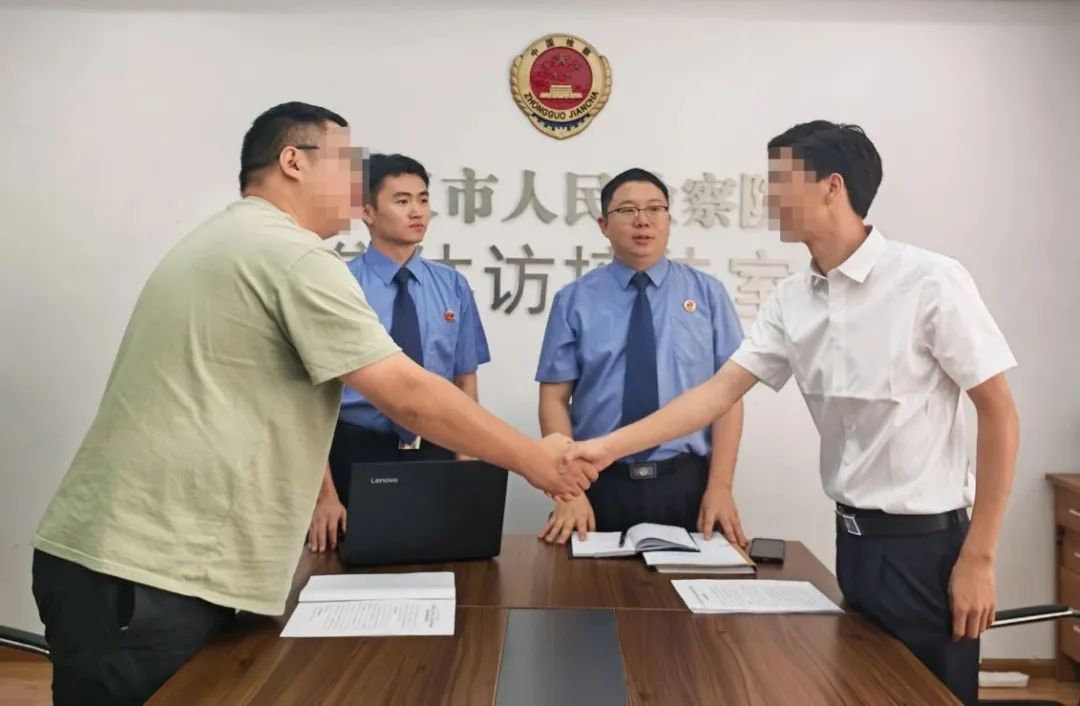 在检察官的见证下,李某(左)和技术公司法定代表人握手言和。