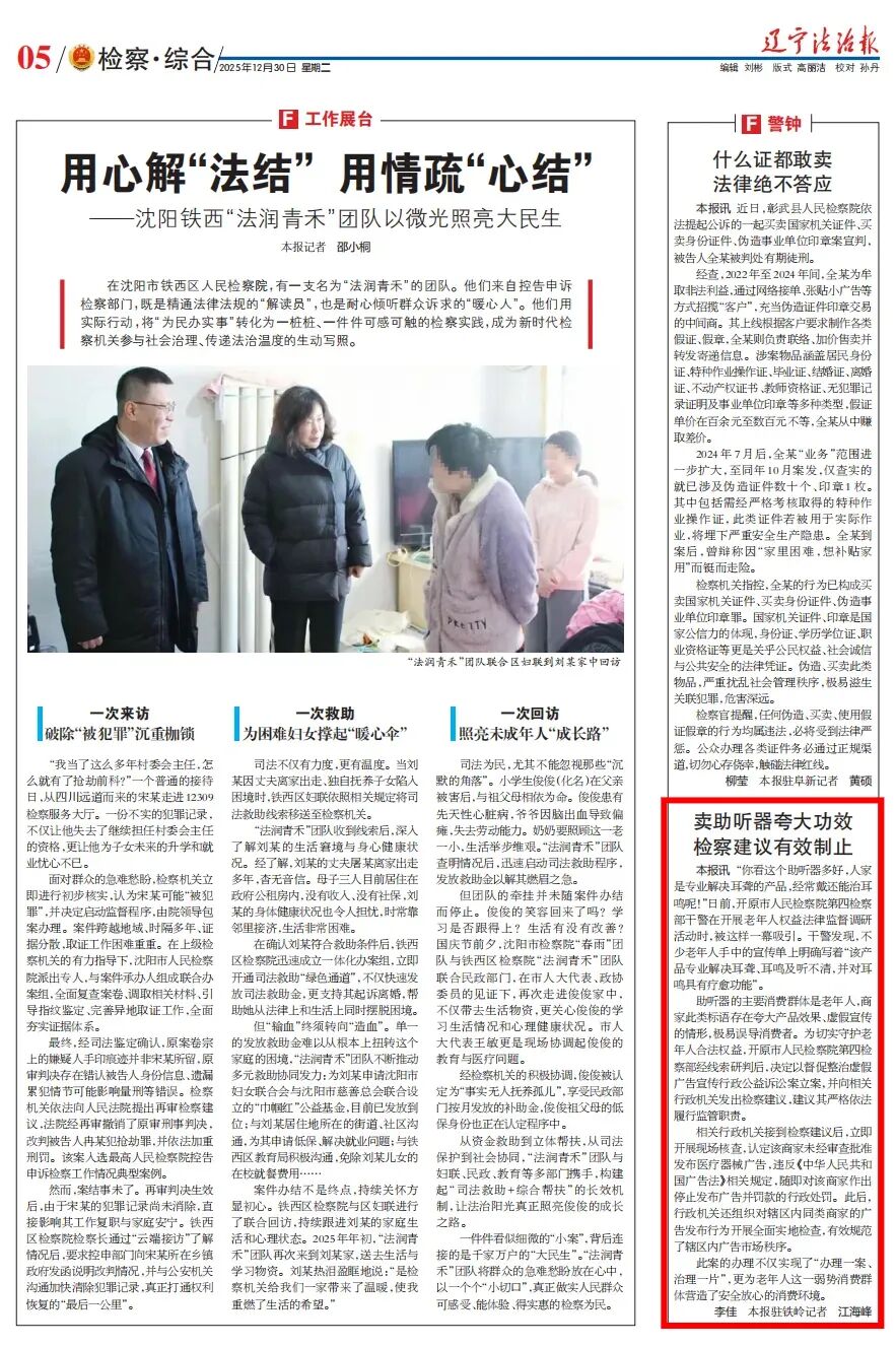 2025年12月30日,辽宁法治报发表开原市人民检察院卖助听器夸大功效 检察建议有效制止》一文,内容如下: