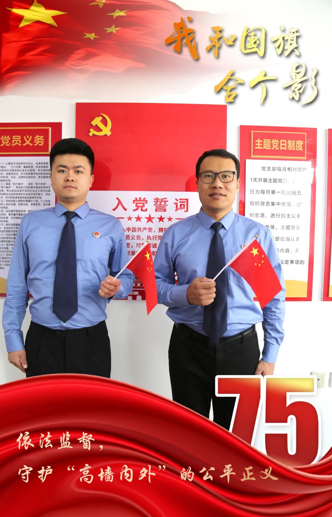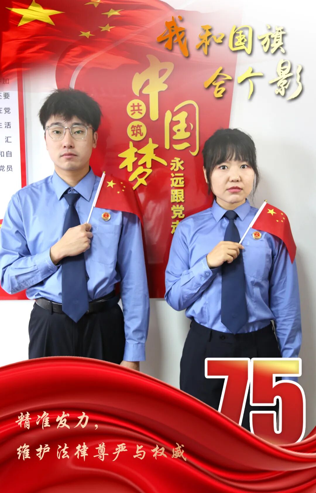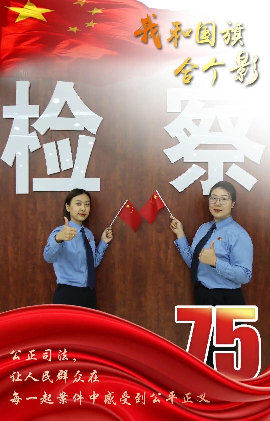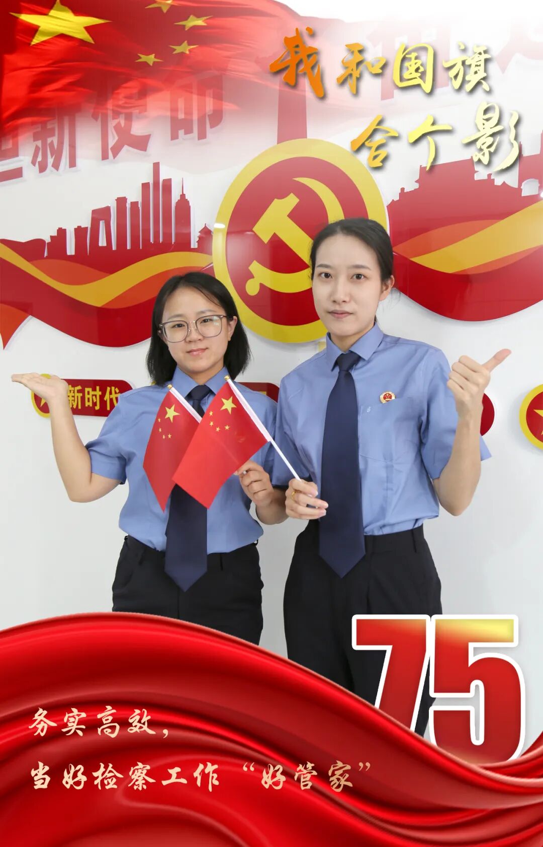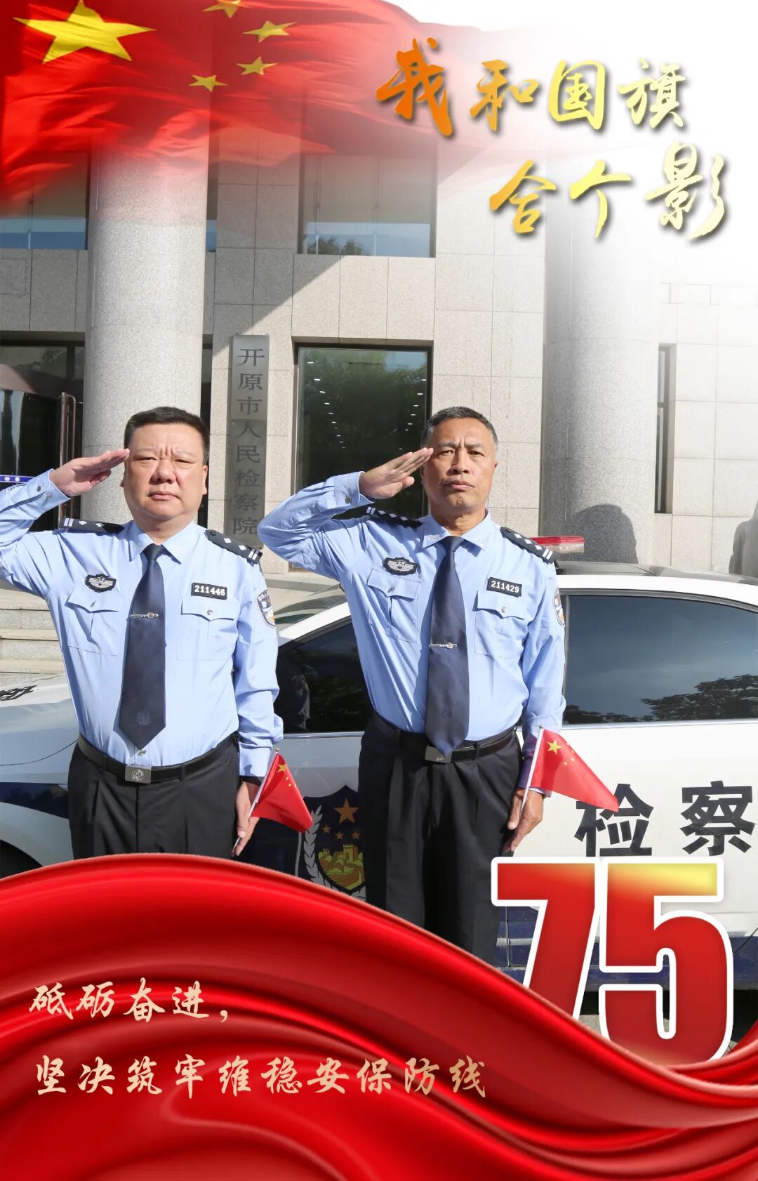 头顶银徽、肩扛繁星、听党指挥、服务人民。风雨兼程,我们忠诚维护社会主义法治;目光如炬,我们捍卫法律尊严与权威。面对新形势新任务新要求,我们将以更昂扬的斗志、更扎实的作风,认真履职,为检察工作现代化保驾护航。喜迎新中国75华诞,祝愿伟大的祖国繁荣富强!