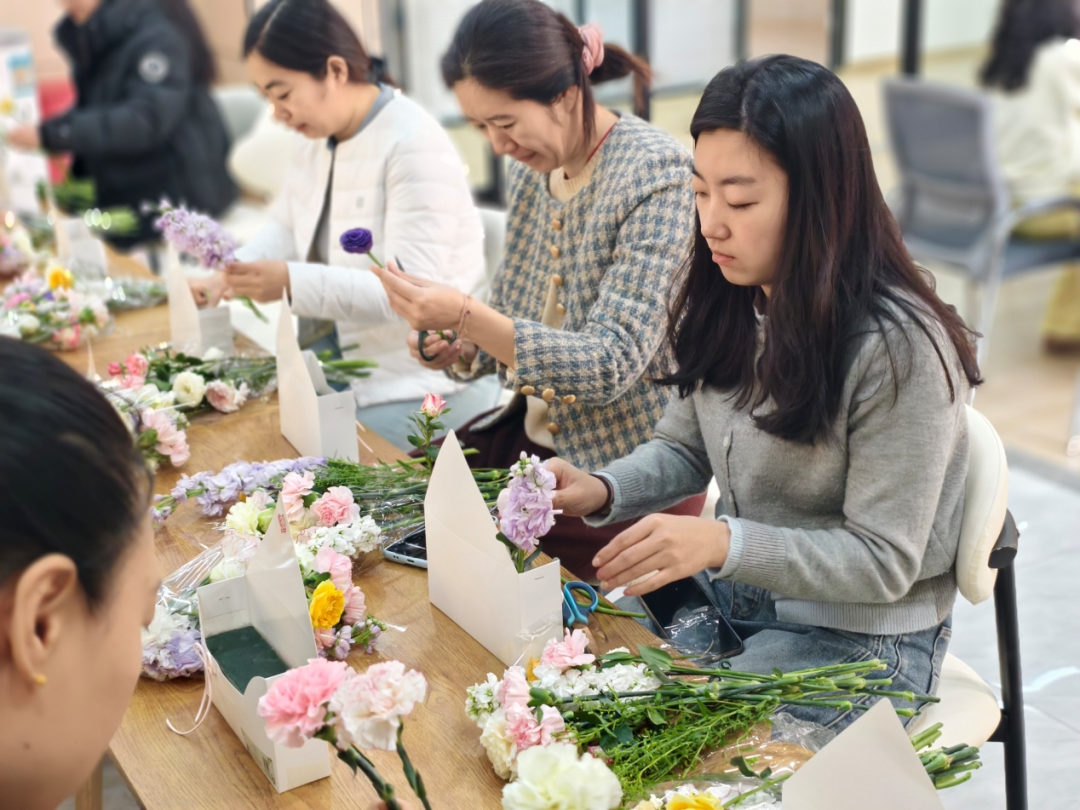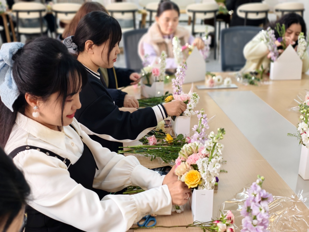活动中,图书阅览室变成了香气四溢的“春日花园”,长桌上摆满了康乃馨、玫瑰、铃兰、洋甘菊等各色花材,馥郁的花香驱散了工作的疲惫,让大家瞬间完成从“检察官”到“花艺师”的转变。